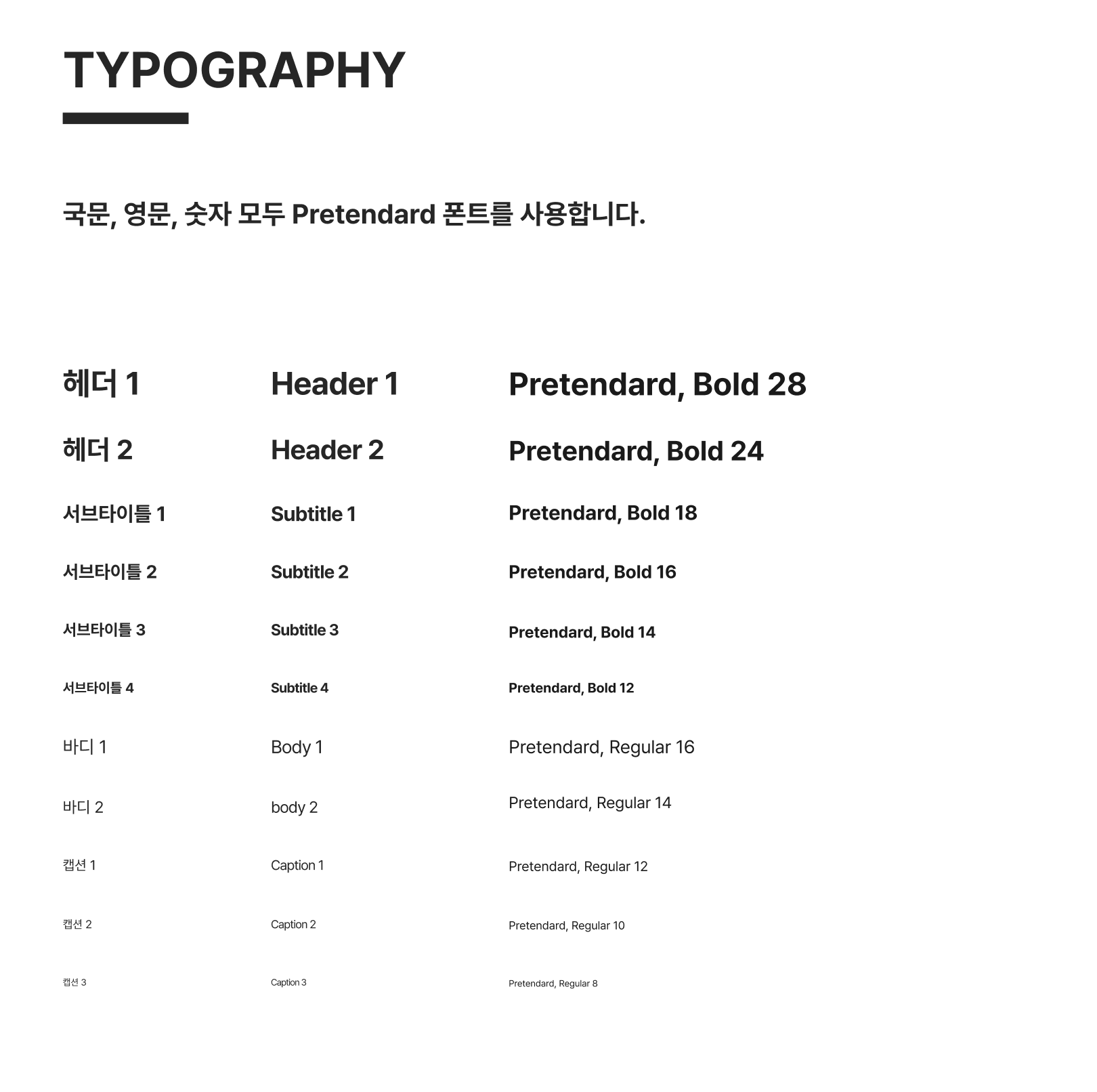 ํฐํธ๋ Pretendard ํฐํธ๋ฅผ ์ฌ์ฉํ์ด์. ๊น๋ํด์ ์ข๋๋ผ๊ตฌ์. ๊ฐ๋ฐํ๋ฉด์ ๋๋๊ฑฐ์ง๋ง, ๋์์ด๋์ ์๊ณ ๋ก์์ ์ ๋ง ๋ง์ด ๋๊ผ์ต๋๋ค... ์ ๊ทธ๋ฆฌ๊ณ ์ฒ์์๋ Bold์ Regular๋ง ์๊ฐํ์๋๋ฐ Medium weight์ ํฐํธ๋ ํ์ํ๋๋ผ๊ตฌ์.. ํ์คํ ์๊ฐ์ด ๋ง์ด ์์ด์ ๋์์ธ ๊ณํ์ ๋ ๊ผผ๊ผผํ ์ธ์ฐ์ง ๋ชปํด์ ์์ฌ์ ์ด์...