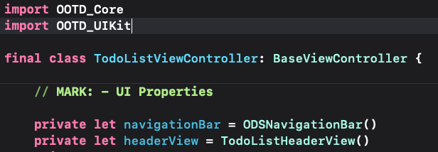 OOTD_UIKit ๋ชจ๋์ importํ๊ณ ํด๋น ๋ชจ๋์์ ์ ์ํด๋์ ODSNavigationBar ์ปค์คํ ํด๋์ค๋ฅผ ๋ถ๋ฌ์ ์ฌ์ฉํ๋ ์์ ๋๋ค. ์ฝ๋๋ฅผ ๋ ์์ธํ ๋ถ์ํ๊ณ ๋ด์ฉ์ ์ ๊ธฐ์๋ ๊ธ์ด ๋๋ฌด ๊ธธ์ด์ง ๊ฒ ๊ฐ์์ ํด๋น ๋ถ๋ถ์ ๊ด์ฌ์ด ์์ผ์ ๋ถ๋ค์ ๋์์ธ ์์คํ ์ ๋ํด์ ์ฐพ์๋ณด์๋ฉด ์ข์ ๊ฒ ๊ฐ์ต๋๋ค.