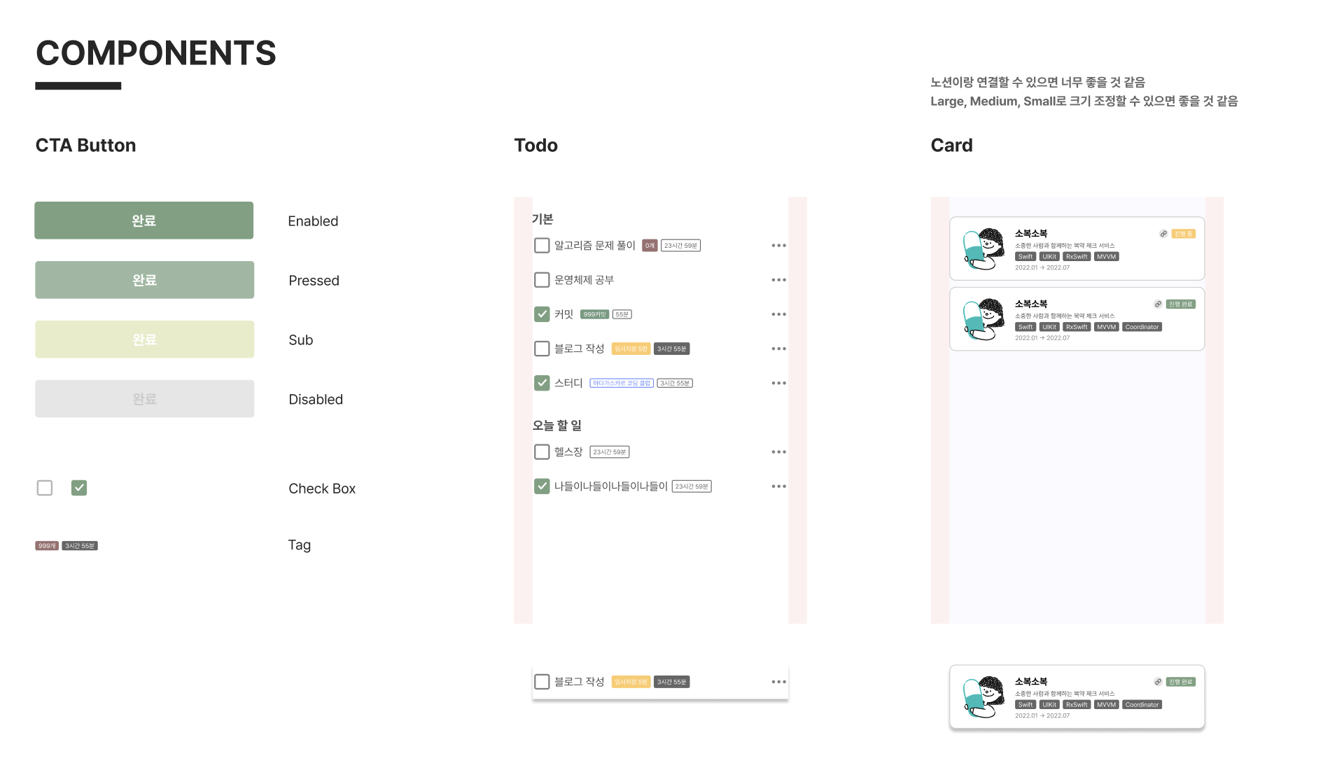 ๋ณธ๊ฒฉ์ ์ธ ์์ด์ด ํ๋ ์๊ณผ ๋ ์ด์์์ ๋ง๋ค๊ธฐ ์ ์ ์ฌ๋ฃ๋ฅผ ์ค๋นํ๋ ค๊ณ ํ์ต๋๋ค. ์ฌ๊ธฐ์ ์ฌ๋ฃ๋ผ๊ณ ํจ์ Color, Typography, Icongraphy, Spacing, Radius, UI Components ๋ฑ์ ์ด์ผ๊ธฐํฉ๋๋ค. ๋ญ ๋ ๋ง์ ์ซ๋ ์๊ฒ ์ฃ ? ์ฌ๋ฃ๋ฅผ ๋จผ์ ์ค๋นํด๋๊ณ ๋์์ธ์ ์์ํ์ต๋๋ค. ์ ๋ง ๊ฐ์ธ ํ๋ก์ ํธ๋ผ ์ ๋ง๋๋ก ๋ฌํํ๊ฒ ํ ๊ฒ์ด๋ผ์ ์ ๋ฌธ๊ฐ์ ์ ์ฅ์์ ๋ณด๋ฉด ํ์ ํ ์๋ ์์ด์.. ๊ทธ๋ฅ ์ฐธ๊ณ ๋ด์ฃผ์ธ์ ใ ใ