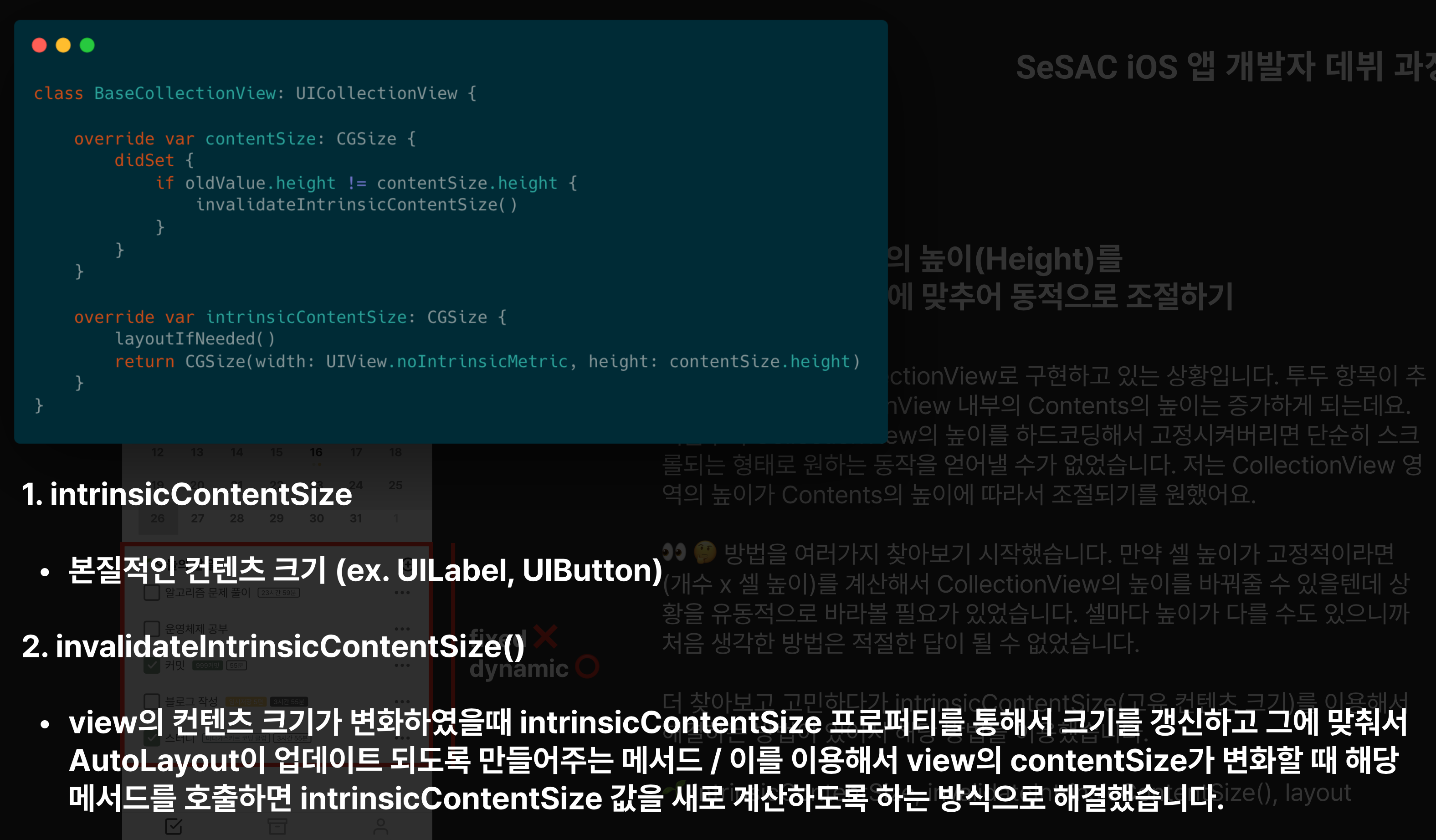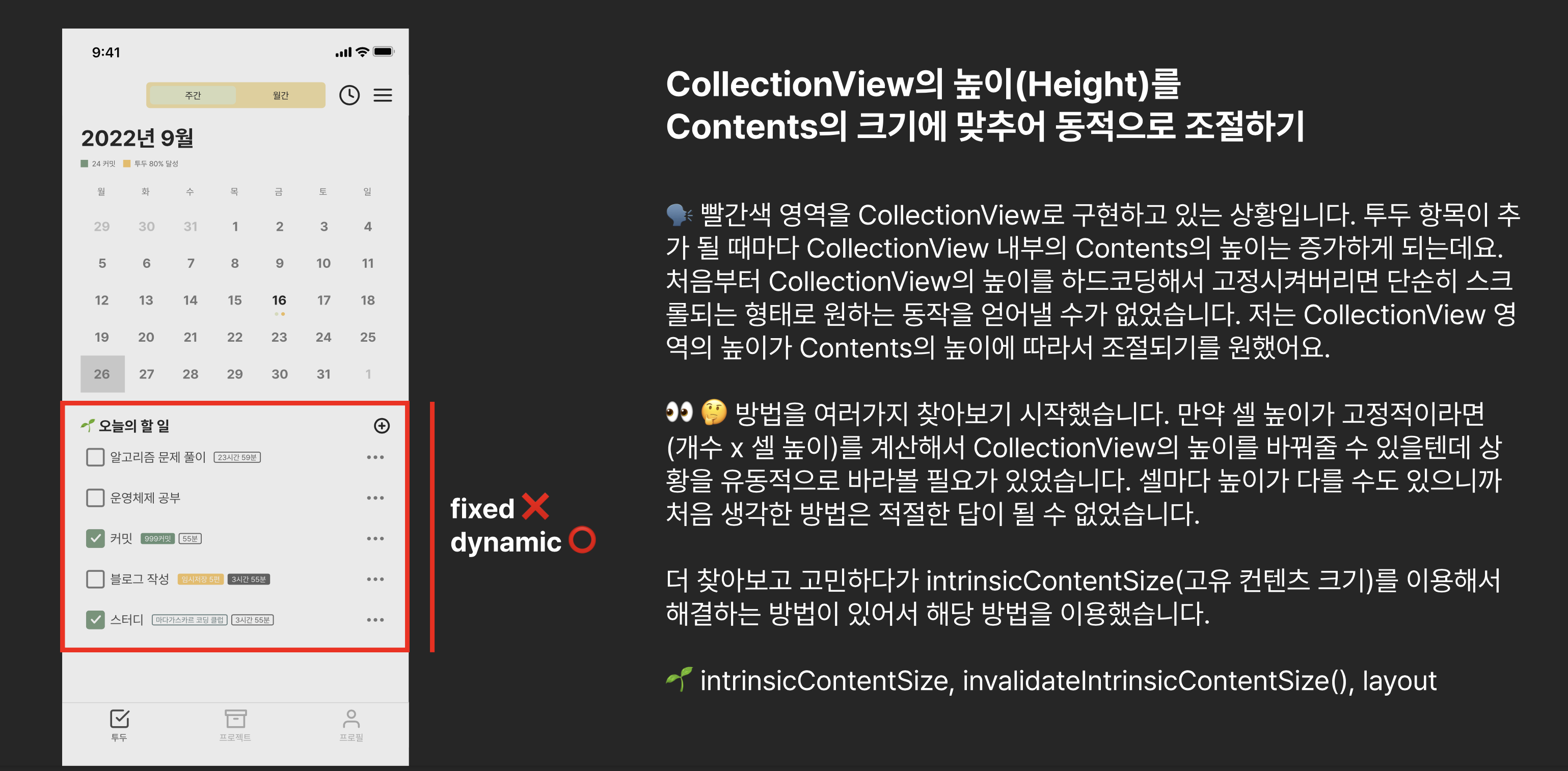 - CollectionView์ ๋์ด๋ฅผ Contents์ ํฌ๊ธฐ์ ๋ง์ถ์ด ๋์ ์ผ๋ก ์กฐ์ ํ๊ธฐ