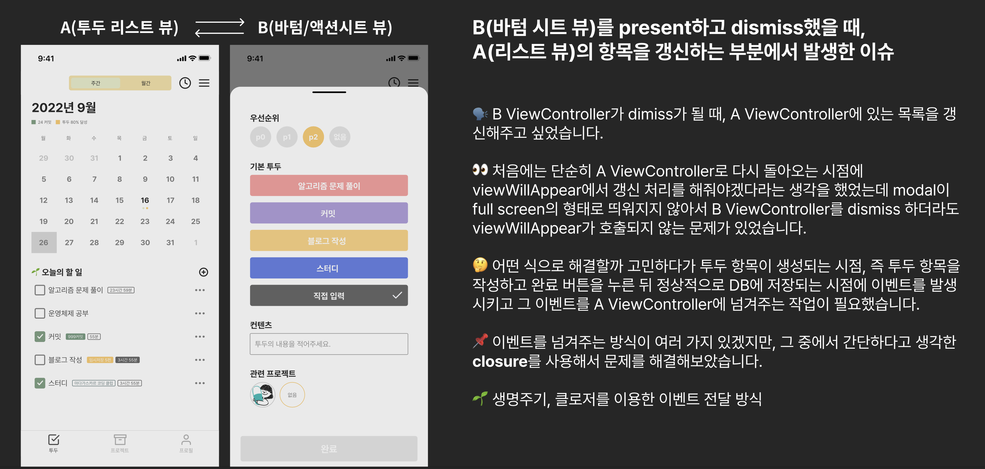 - B(๋ฐํ ์ํธ)๋ฅผ presentํ๊ณ dismissํ์ ๋ A์ ํญ๋ชฉ์ ๊ฐฑ์ ํ๋ ๋ถ๋ถ์์ ๋ฐ์ํ ์ด์