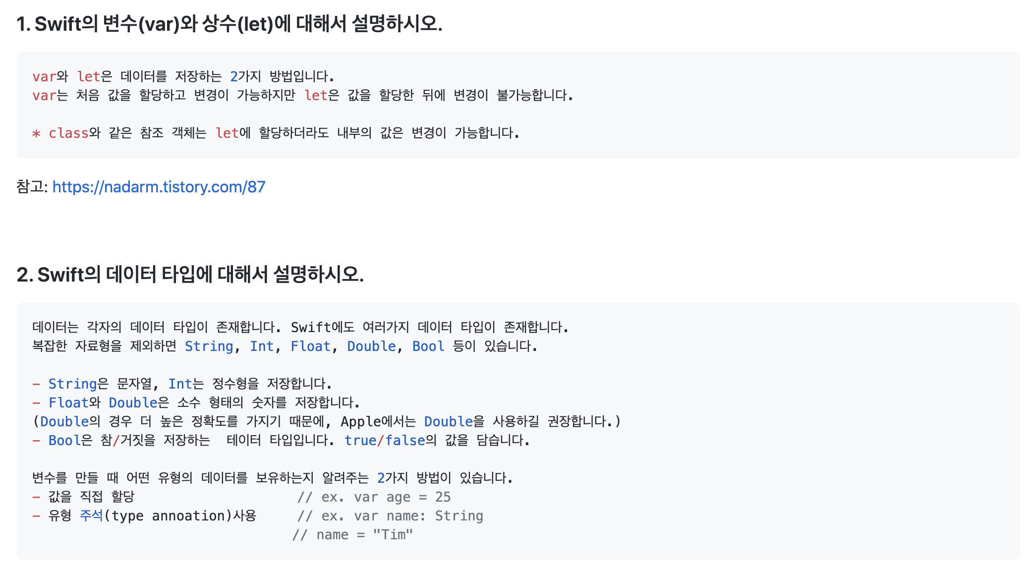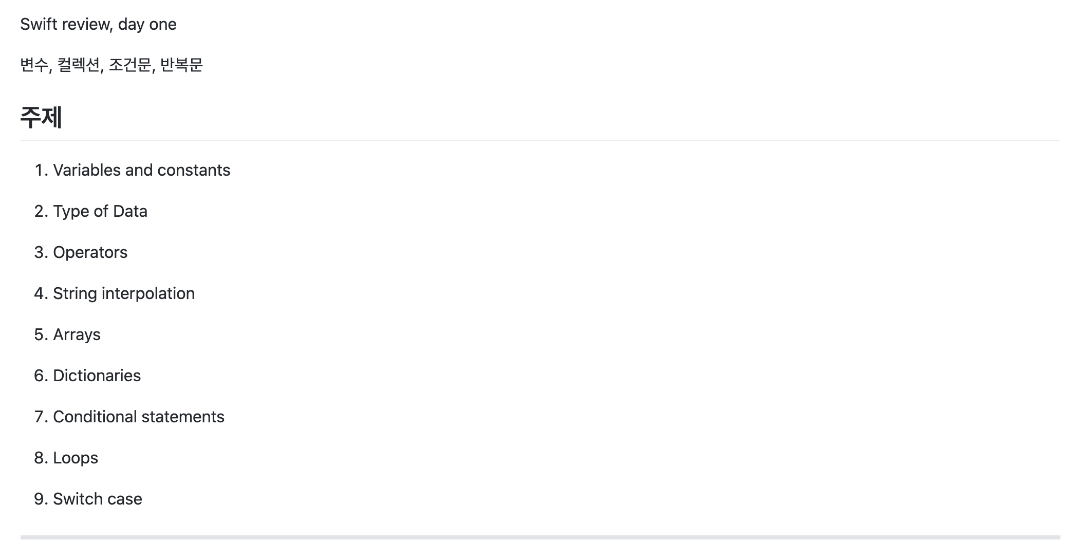 서론이 너무 길었네요! 13일차에는 스위프트 문법 복습을 했습니다.