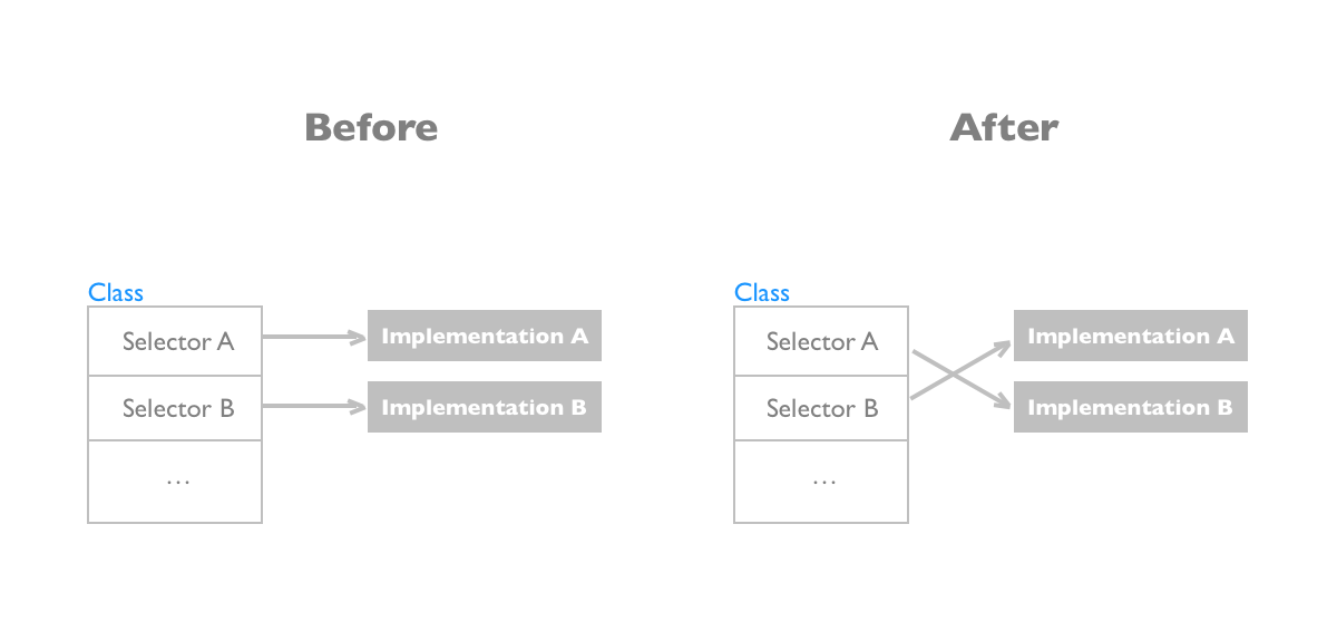 Method Swizzling์ ๊ธฐ์กด์ ๋ฉ์๋๋ฅผ Runtime ์์ ์ํ๋ ๋ฉ์๋๋ก ๋ฐ๊พธ์ด ์ฌ์ฉํ ์ ์๋๋ก ํ๋ ๊ธฐ๋ฒ์ ๋๋ค.